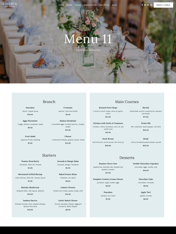 Menu, About Us, Reservation, Contact, Meet the Team, Portfolio, Gallery, Pricing, FAQ and more